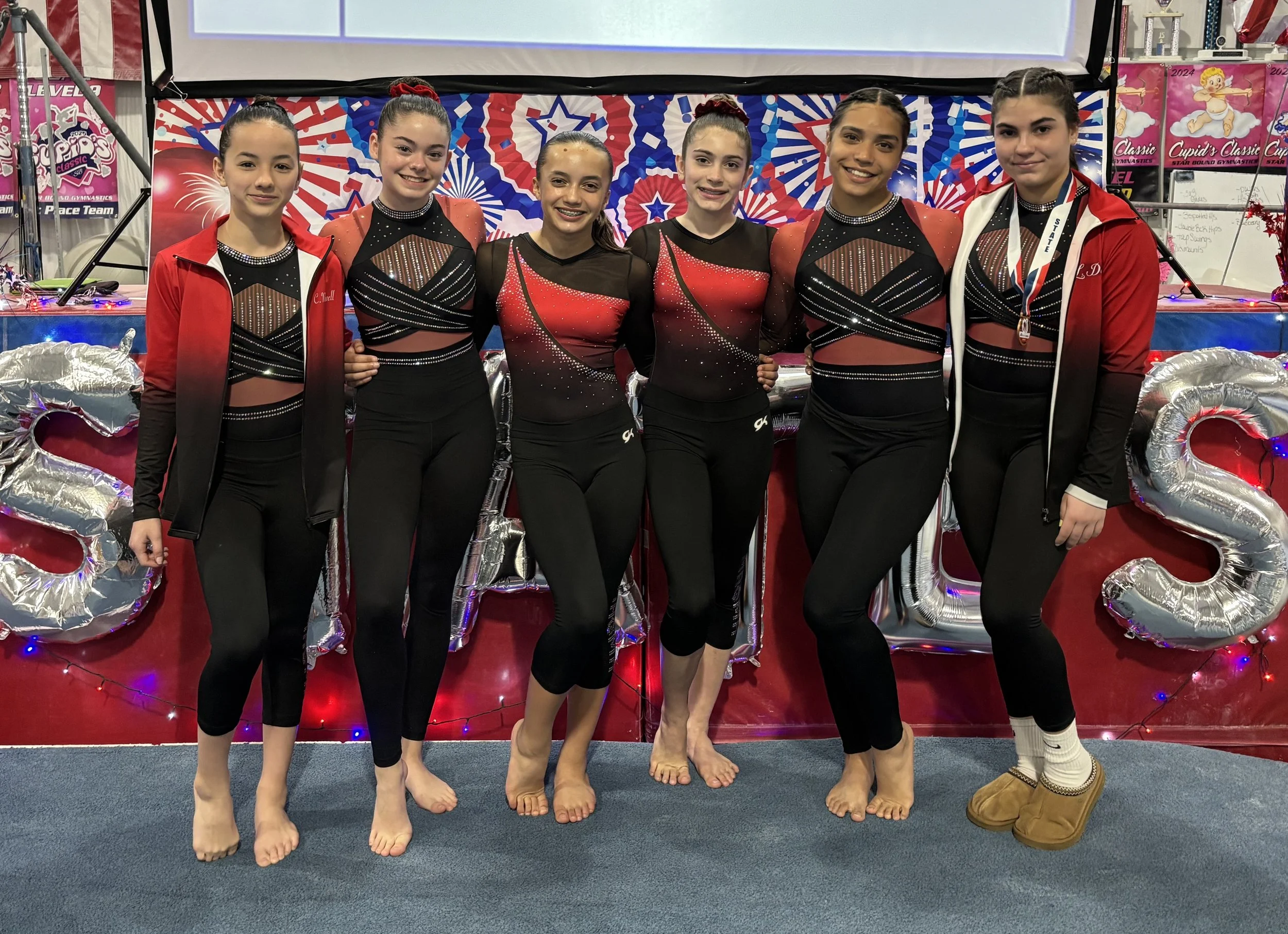 7) Awards are given to the top athletes placing based on age groups, designated by birthday of when states is assigned. Awards for vault, bars, beam, floor, all around, and team. Some meets will award the top half of qualifiers and ties are determined by highest individual scores. Team is the top three scores in each event totaled.